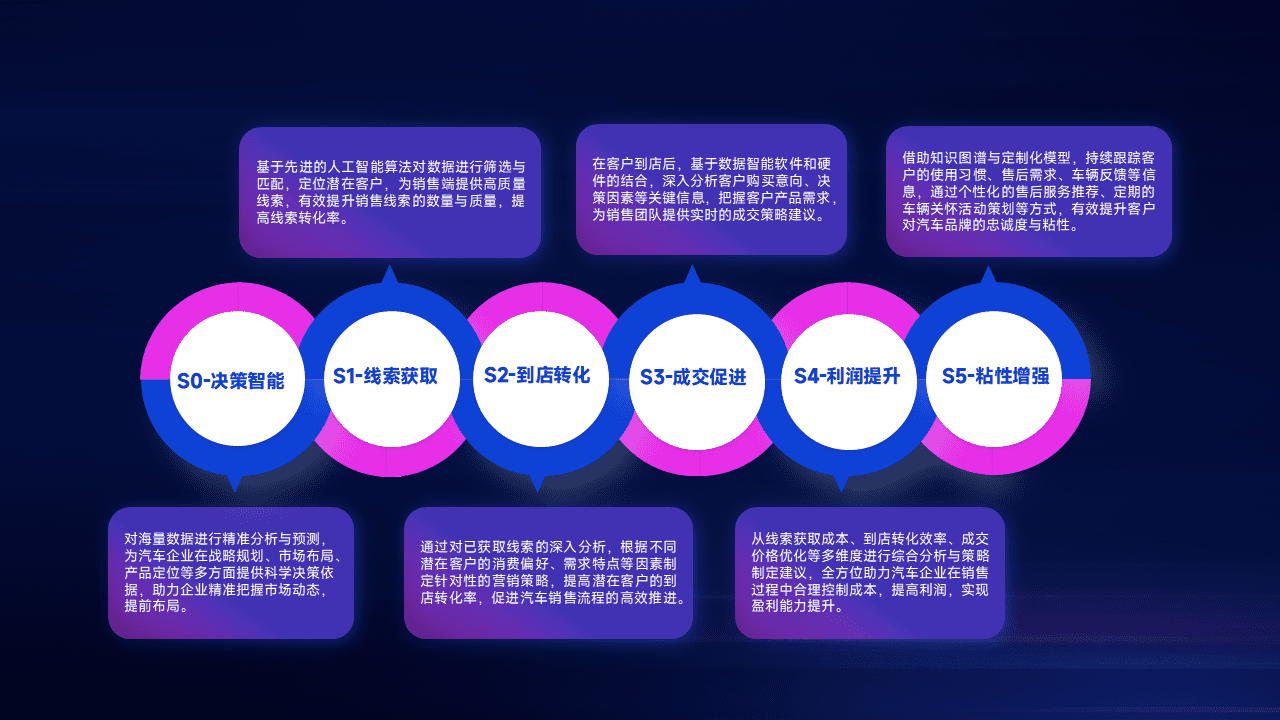 通过拓宽潜在客户来源、、、、优化线索分配并提高到店转化率,,,,以增强销售效率。。同时,,,利用线索数据不断优化分析模型,,有效提升转化率,,扩大营销影响力。。。
